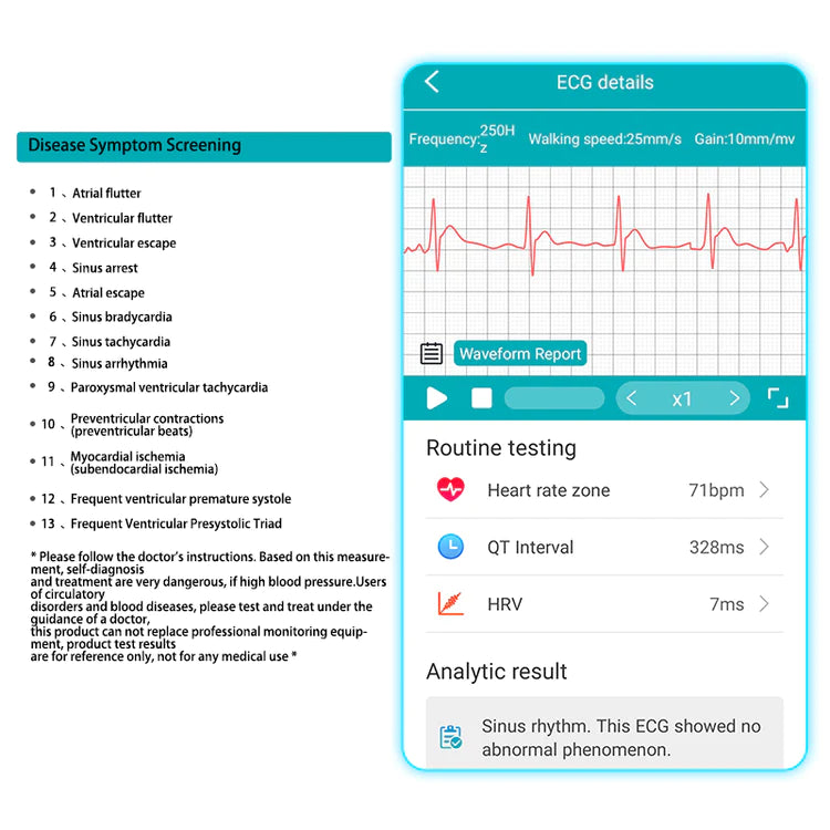 Through intelligent analysis of big data, compare withmore than 10 kinds of heart diseases.No need to goto the hospital, know your physical condition anytimeand anywhere.