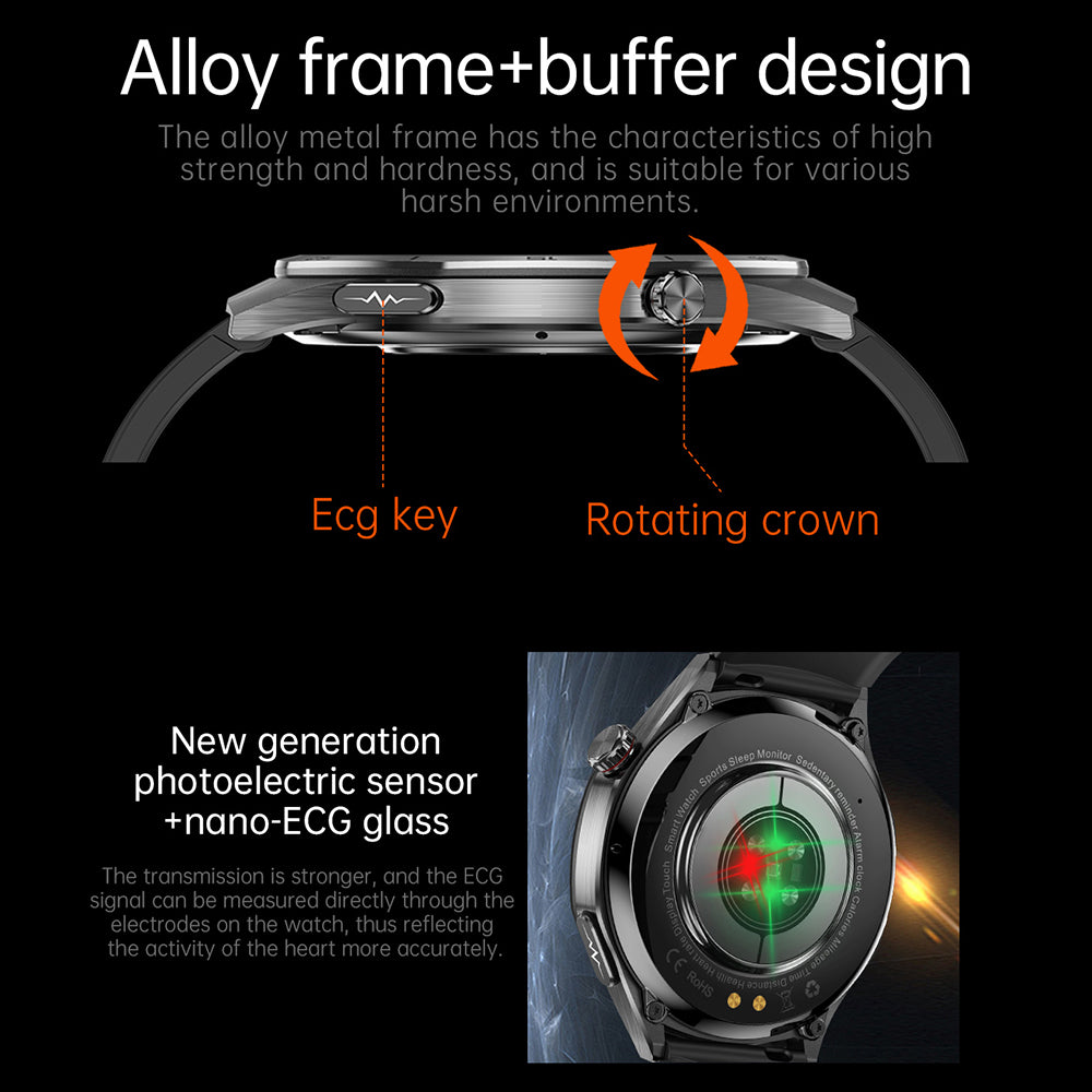 It features modern nano-ECG glass on the back and stainless steel electrodes on the sides. This design ensures smooth ECG signal transmission, providing clear and accurate waveforms and reports. We can't wait for you to experience this innovative technology!