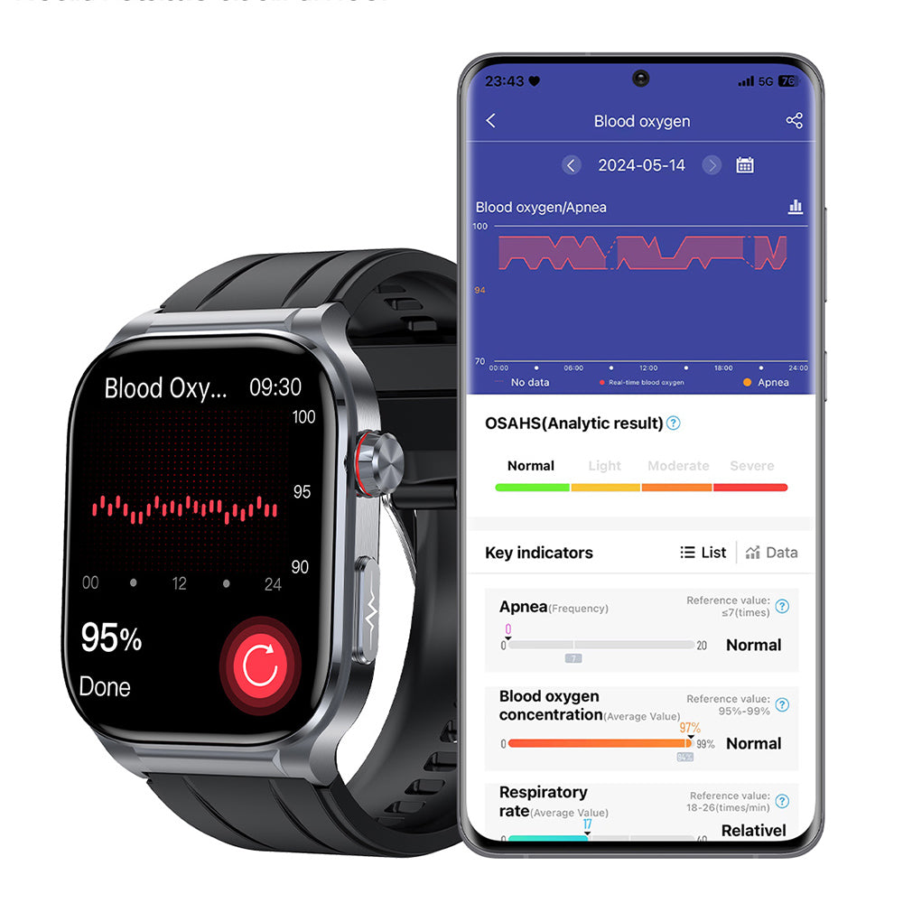 Blood oxygen saturation is related to brain and heart health. The watch monitors blood oxygen and analyzes and studies sleep and apnea syndrome in conjunction with the APP. Professional optical lens sensors can wake you up in time when you have low oxygen levels during sleep at night, always protecting your health.