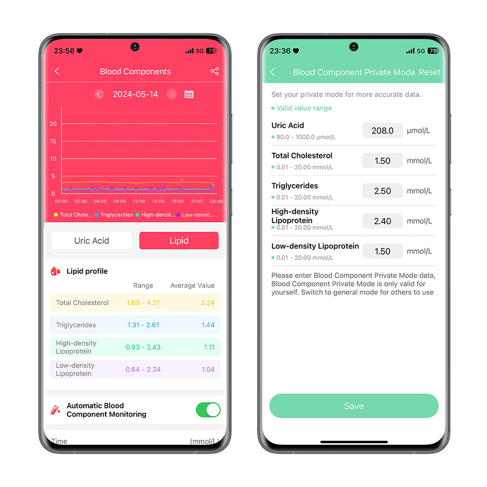 Uric acid, total cholesterol, triglycerides, high-density lipoprotein and low-density lipoprotein are measured and analyzed to help you understand the health status of blood components in real time, and you can set a private mode to obtain more accurate health private data.
