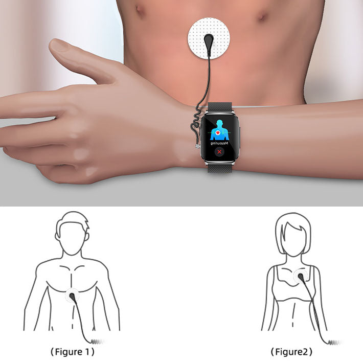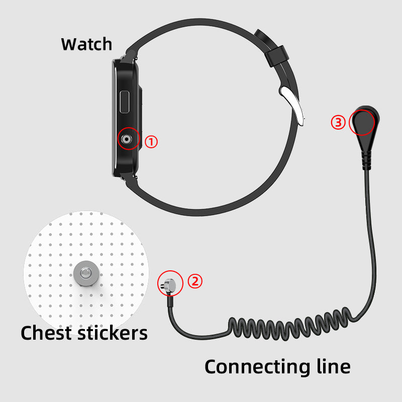 1)Put Chest Sticker On The Connecting Wire ③, And Then install The Connecting Wire ②) On Watch ①.2)After The Watch Connected To The APP, Find Out PTT In the Side Button Function Of The Watch, And Then Tap The button To Test.3)You Can See The Dynamic ECG On The APP.