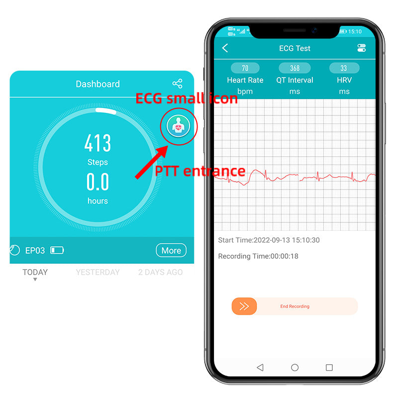 When the PTf running normally,there is a small EcG icon appear in the upper right corner of the APP data panel, tap the small icon to enter and start recording.
