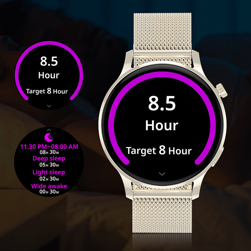 Boasting a 1.30-inch AMOLED display with 360x360 high resolution, this watch features a stunning 3D large curved glass cover. The front and rear vacuum plating process ensures a sleek, premium look and feel.